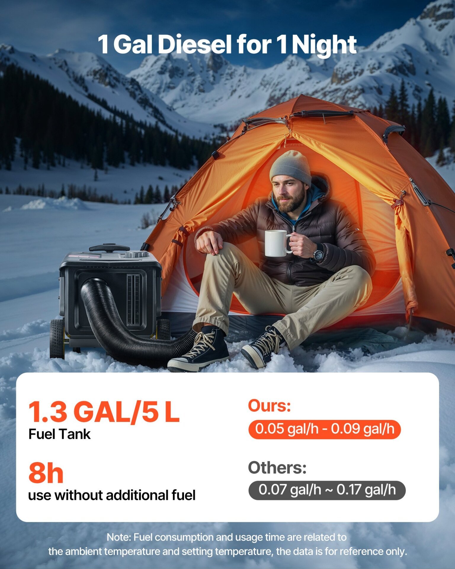 This portable diesel heater features a quiet, energy-saving fuel pump and burns 0.05–0.09 gal/h with over 90% efficiency. The 1.3 gal fuel tank supports all-night heating without refueling, reducing fuel use and energy waste