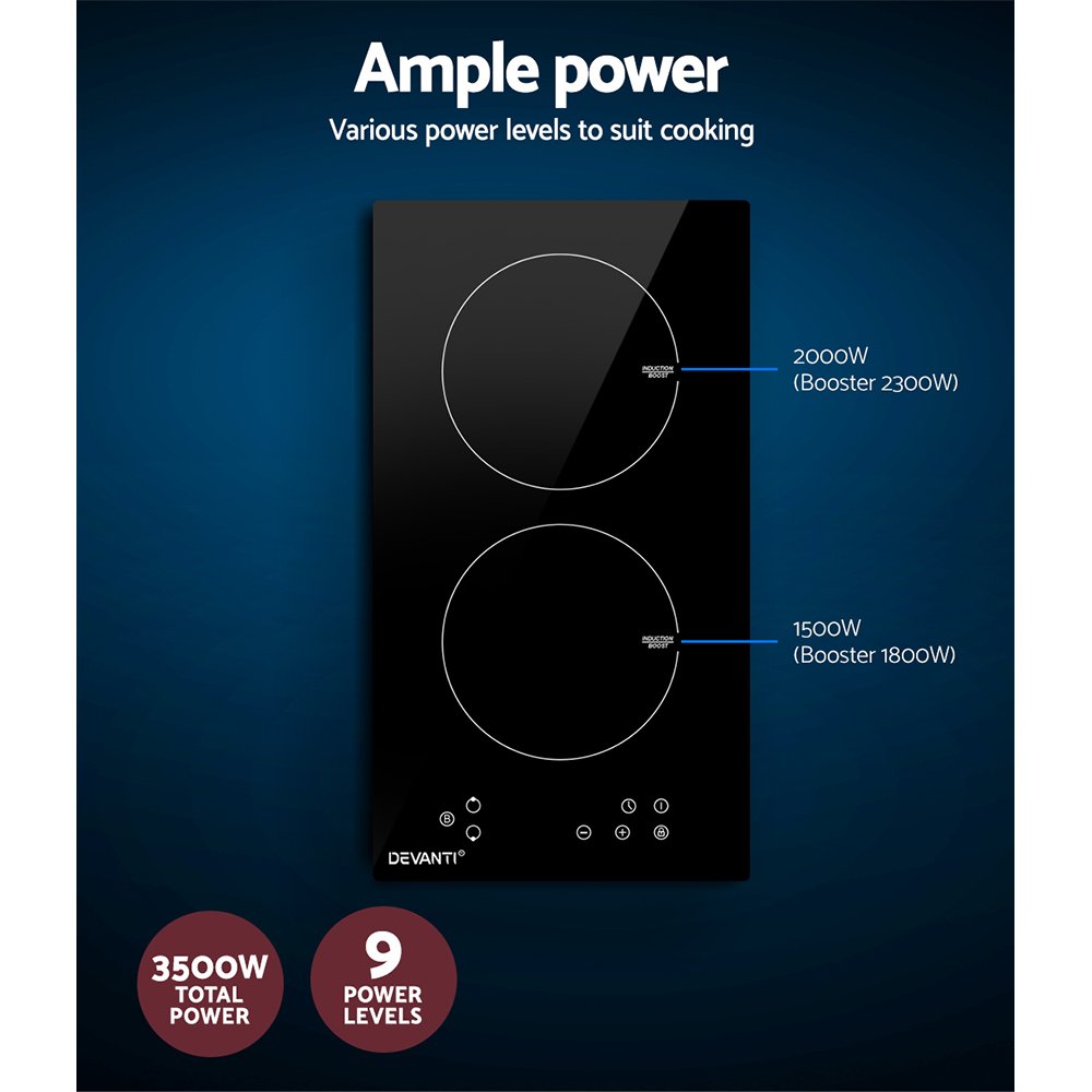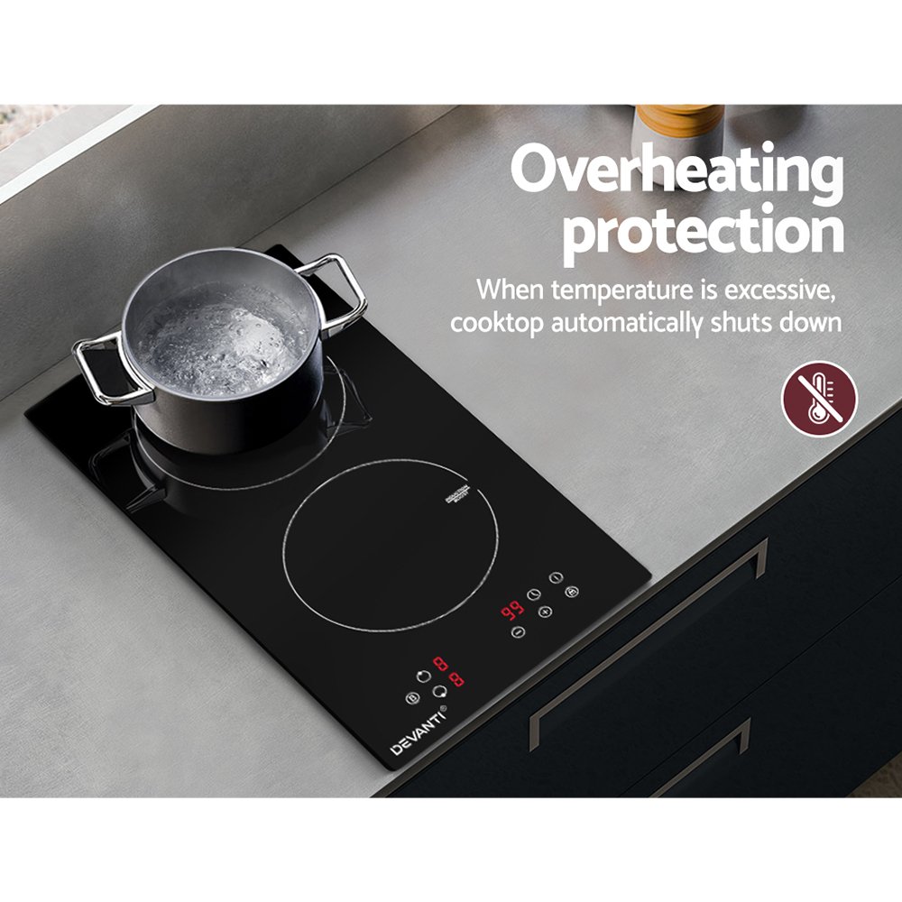 Whether it is for your existing or new home, the Devanti 30cm Induction Cooktop is just the thing you need for easy, no-fuss cooking. The cooktop is loaded with an extensive list of chef-friendly features such as two high-wattage cooking zones, touch controls, an LED display panel, independent 99-min timers, overheat protection and efficient heat dissipation. It is also incredibly sleek with its high-grade black ceramic glass plate. It features nine power levels to choose from to prepare that perfect dish. Plus, the residual heat indicator also helps to tell when it is safe to touch the cooktop after turning the hot plates off, and a child safety lock prevents accidental use. Better still, the cooktop will turn itself off when temperatures get excessively high, or you simply forget to turn it off after your cooking. Powerful and yet integrally safe, the cooktop promises many moments of hassle-free delicious cooking with the right blend of sophistication and class for your kitchen.