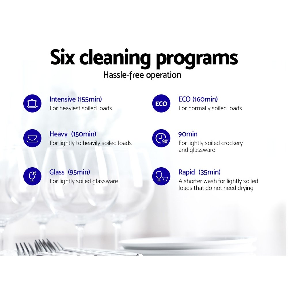 The quiet-operation benchtop dishwasher features eight place settings and six cleaning programs, from intensive to rapid, and a delay start function for that perfect wash. The easy-to-use LED screen display easily guides you along with clear setting indicators for effortlessly dishwashing. Not least, it comes with all the accessories to accommodate your various kitchen, dining and cooking wares and you easily add in left-out dishes to the washing cycle.