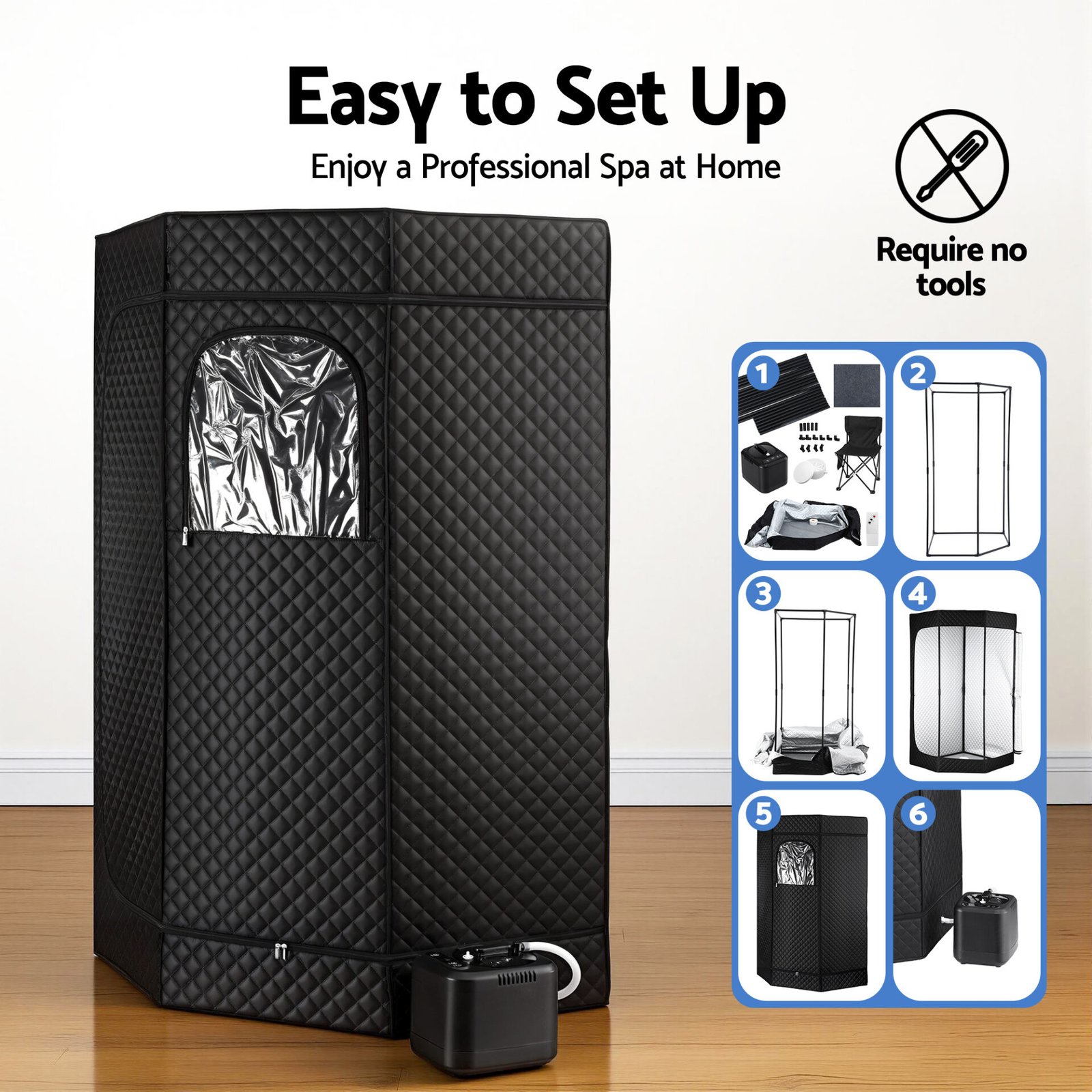 Elevate your self-care routine with our portable personal steam sauna! With SAA certified plug included, it features a 3L steam pot with overheat protection, ensuring a worry-free home spa experience. The 9-level temperature control (up to 54℃) and 10-60 minute smart timer allow you to customise your relaxation. Crafted with a durable 304 stainless steel liner and equipped with UV atomization, this sauna delivers efficient, hygienic steam sessions. Its solid metal frame, double-sided zip, and side pocket for phone storage add convenience. Plus, the foldable chair, floor mat, and tool-free assembly make it perfect for any space. Enjoy rejuvenating steam therapy at home today!