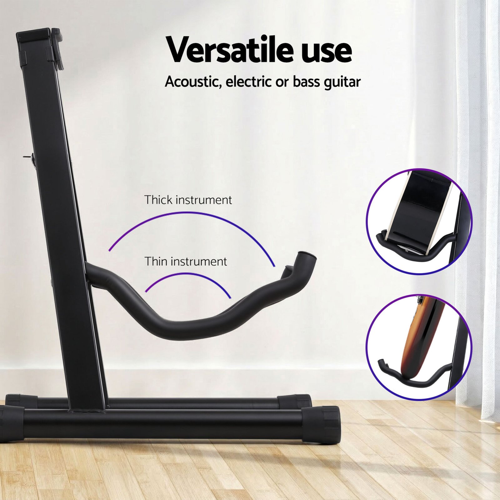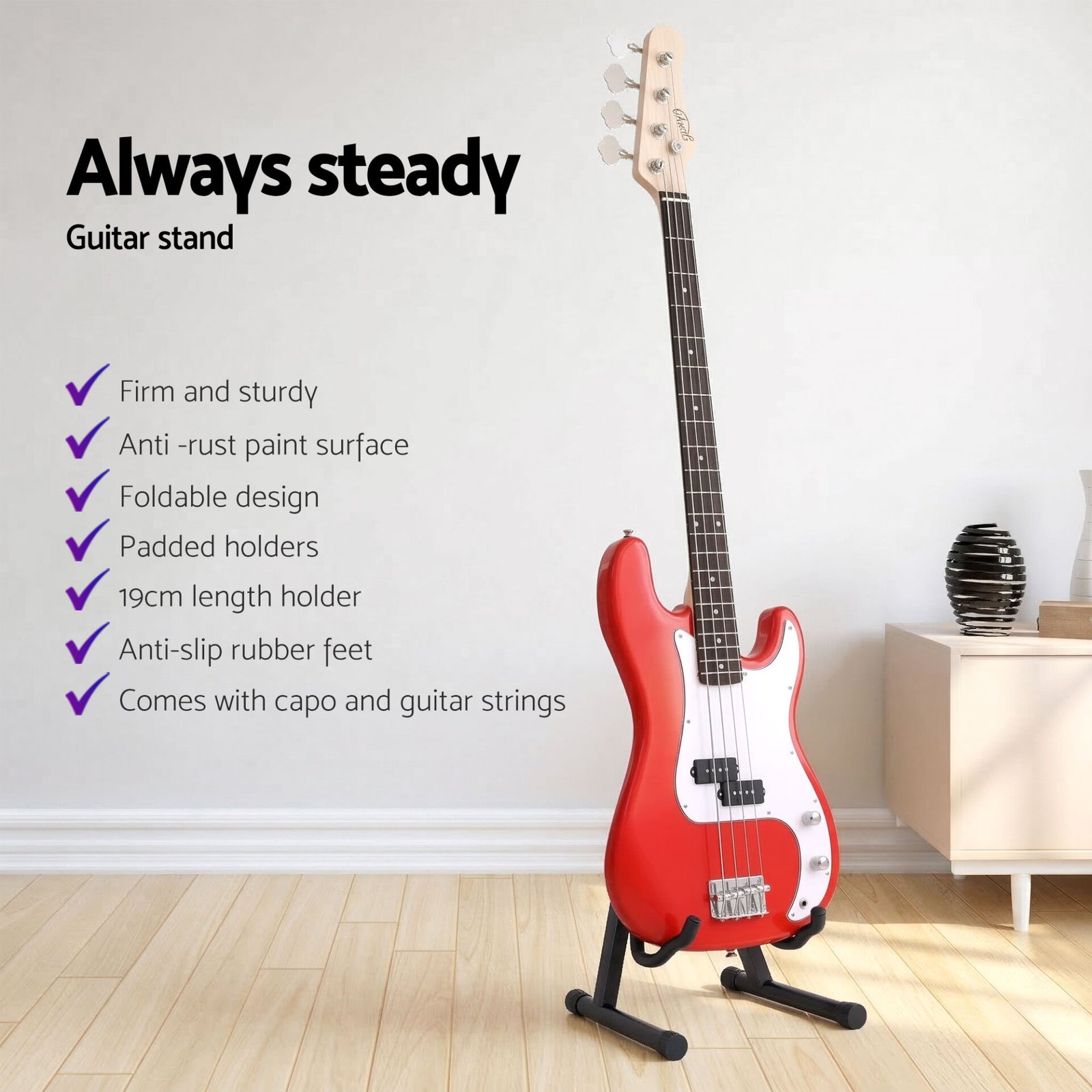 Unleash your inner rockstar with this all-in-one Alpha guitar package, perfect for beginners and experienced musicians to get started right away. The centerpiece is a striking, glossy red electric guitar featuring a comfortable basswood body and a sturdy maple neck; its open-coil humbuckers and 21 frets create a rich and powerful sound. The set includes all the essentials like a gig bag, strap, picks, and spare strings, allowing you to play right out of the box. Shape your perfect tone with the durable and portable 40W practice amplifier, equipped with a solid case, protective corners, and intuitive bass, middle, and treble control knobs. For moments when you’re not playing, the ultra-sturdy, powder-coated steel guitar stand provides safe support for your beloved instrument. Its padded triangular design and anti-slip feet ensure excellent stability, while the foldable frame makes it easy to store or carry to any gig—plus, it comes with a bonus capo and a set of strings as an extra surprise.