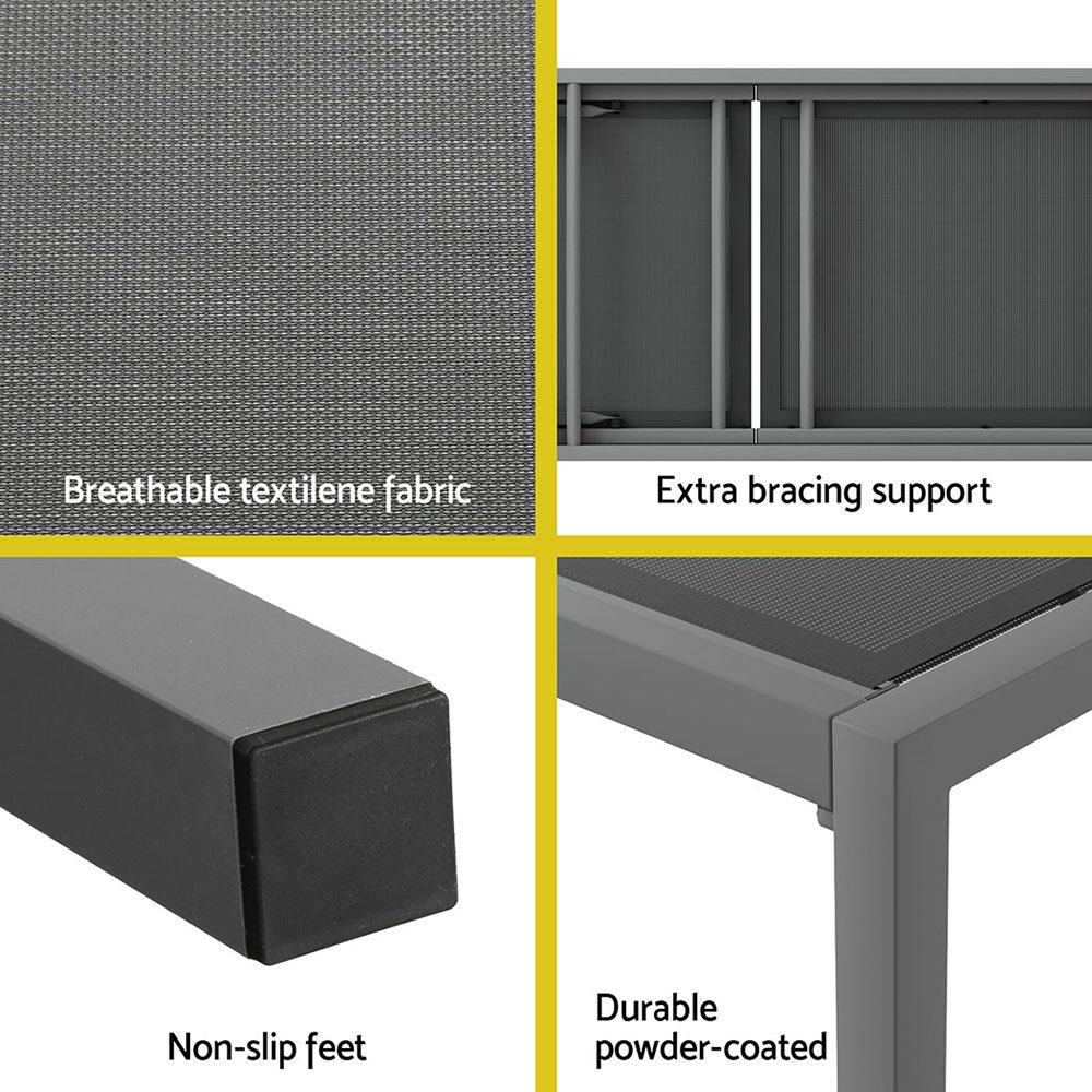 Make the most out of every sunny day with a Gardeon Sun Lounger. Made from breathable textilene fabric on a strong powder-coated aluminium frame, the lounger is sturdy and resistant to weather and corrosion. Non-slip feet and extra bracing support keeps the chair upright and stable with a 150kg weight capacity. 5 adjustable backrest settings offer you the perfect position to rest and relax. Smooth wheels make the chair easy to move and chase the sun. Best of all, the lounger is easily assembled and can be used anywhere such as the beach, the park, poolside or even indoors. Have more fun in the sun with a Gardeon Sun Lounger.