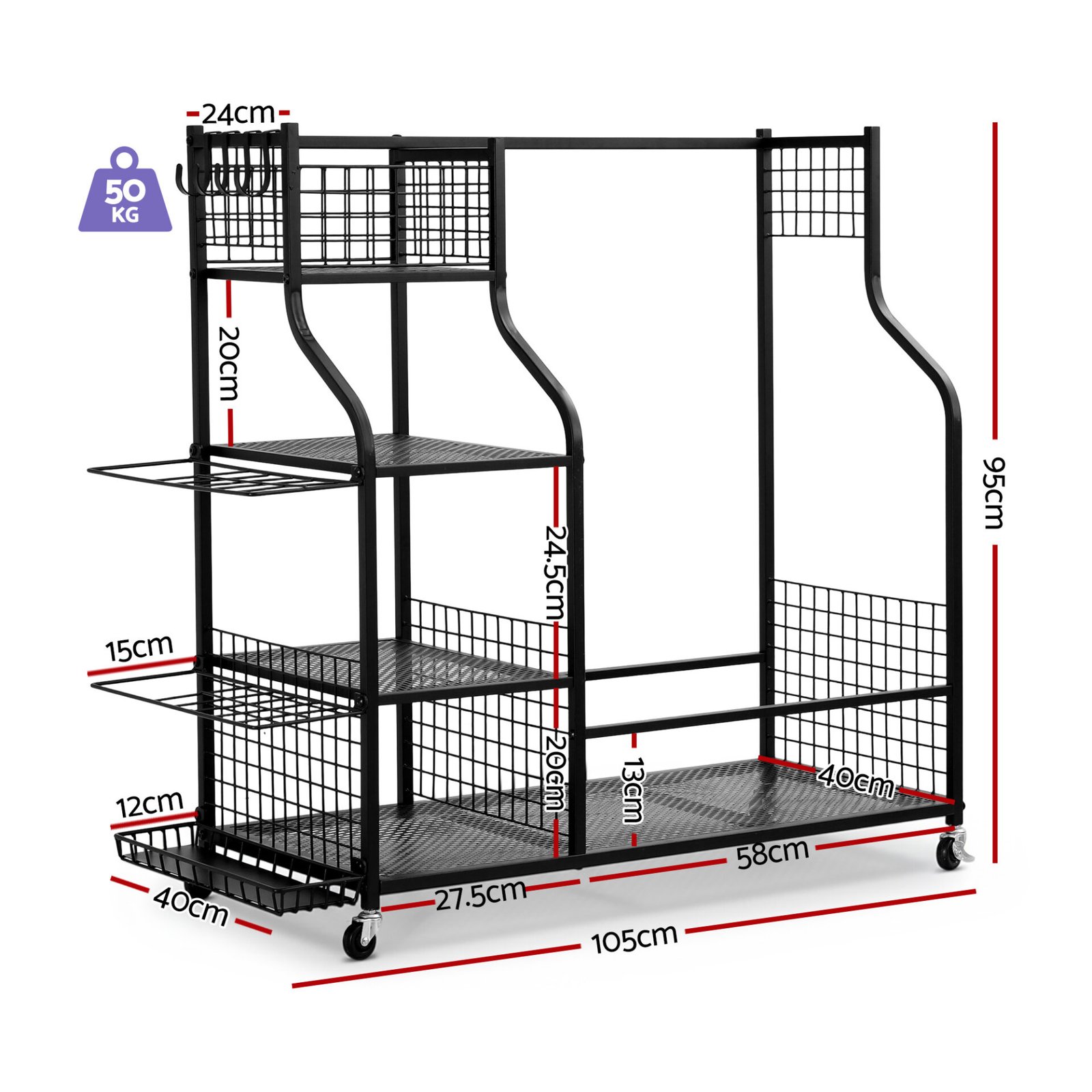 The Everfit Golf Storage Organizer provides ample space for 2 standard golf bags or 1 oversized bag, plus accessories. Features include a sturdy frame, 3 extra medium shelves, and a dedicated club display stand that holds 10 clubs. 2 lockable wheels allow easy mobility between garage, clubhouse or storage areas. The scratch-resistant black finish protects equipment while complementing modern decor.