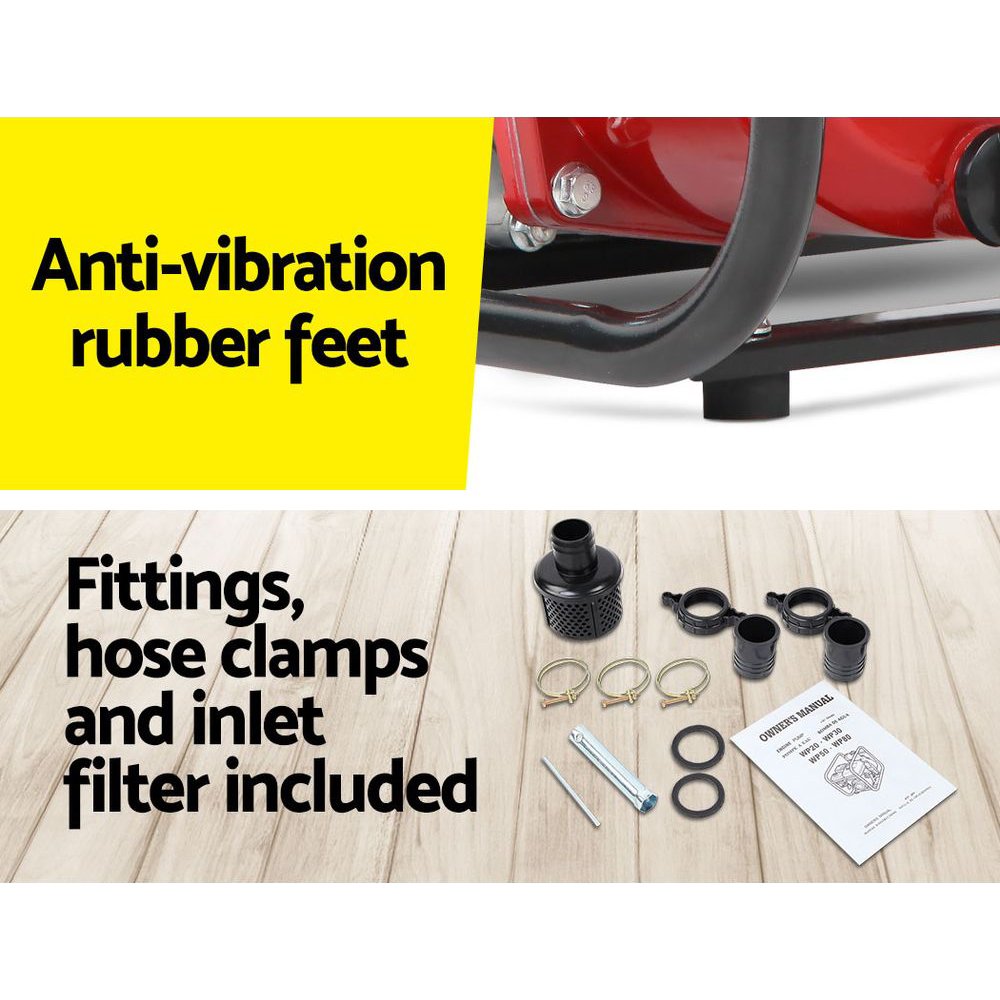 Giantz Petrol Water Pump 7HP Max, 2″ High Flow 4-Stroke Engine Transfer Fire Fighting Pumps Rain Tank Oil Irrigation Garden Farm Pond Outdoor Irrigations, w Hose Fittings Inlet Filter Rubber Feet Red